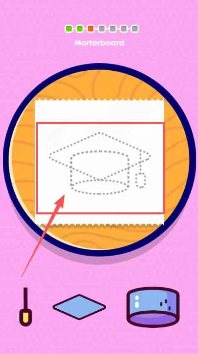 3、粉色背景中央橙圈内,按学士帽虚线轮廓用工具描绘,下方三图标辅助操作。