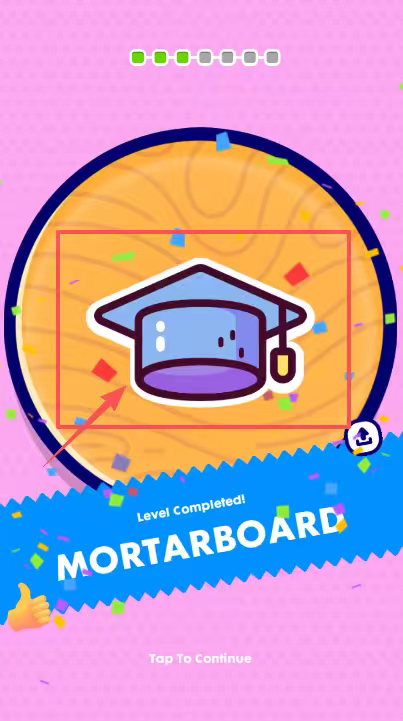 4、橙黄圆里蓝色学士帽被框,点Tap To Continue完成这关进入新关卡。