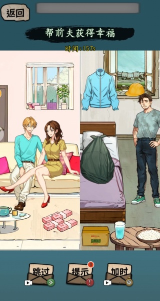 4、仔细观察图片中的所有场景,点击钱给前夫哥,前夫哥穿上外卖服去送外卖了。