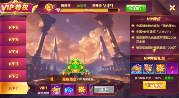 炮台等级:游戏内设有多种等级的炮台,玩家可以通过升级炮台提高捕鱼效率。