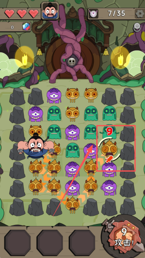 3、底下那个大个子要打上面那排怪物,点右下角显示数字9的攻击按钮,让他去打掉对应颜色的怪物。
