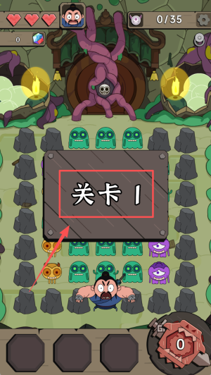 1、这关刚开始先看上面三个红心是血量,中间灰色牌子写着关卡1,等会要打35个怪,现在进度是0。