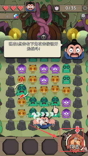 2、按照箭头提示点右下角那个标着数字7的攻击按钮,点一下就能开始打怪,注意看上面写的提示文字。