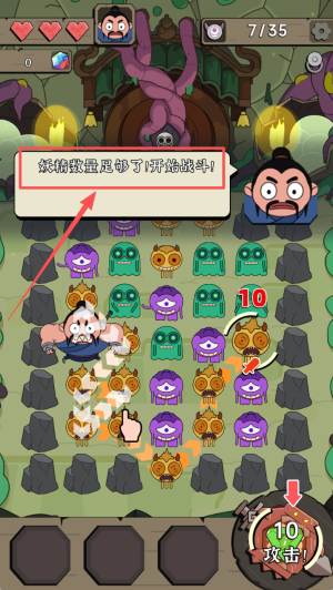 4、看到中间对话框说妖精数量够了,赶紧点右下角标着10的攻击按钮开始战斗,注意别让怪物碰到下面的人。