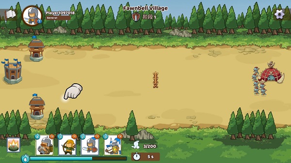 2、成功进入关卡后,在界面的左侧下方,分别是你可用的队伍,蓝色条能是你的能量,不同队伍的招募需要对应的能量才能进行,比如炮兵需要4格、弓箭手需要3格、地雷需要2格、骑兵需要3格,后续玩家还能解锁更多兵种。关于放置,只要满足一定的能量后,拖动屏幕上的兵种到战场上即可。