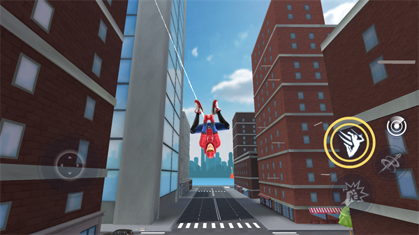 1、游戏的玩法很简单,只需在有限的生命值内击败游戏中的所有歹徒,左侧控制角色的方向,而右侧则是各种技能键,着重介绍一下所有伙伴都好奇的蛛丝发射,长按图示键位吐丝,松开键位时则是收回蛛丝,要想在空中自由摇荡,需要搭配方向键一起操作