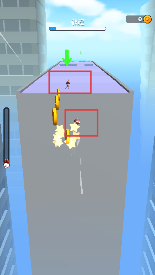 2、抛出手中的球,让球沿路径收集金币,将球传递给下一个角色。