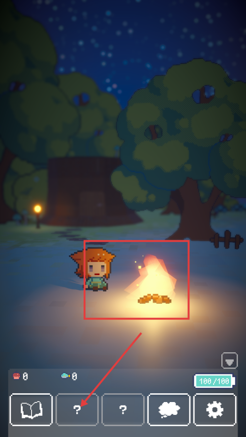 2、在篝火场景,可查看下方功能图标,点击带“?”的图标,探索相关功能,推进游戏进程。