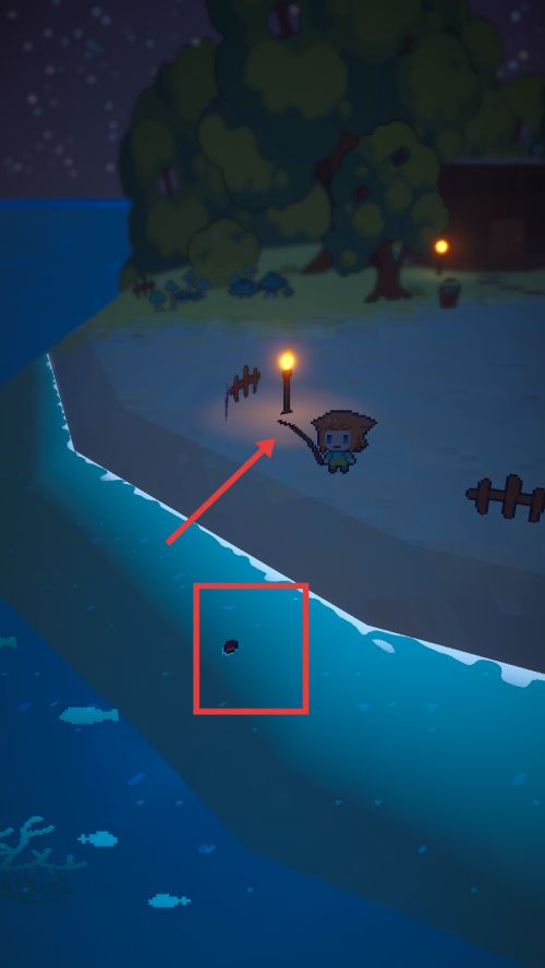 3、在海边场景,靠近发光的灯柱,同时关注海中物品,可进行互动操作,获取游戏内资源。