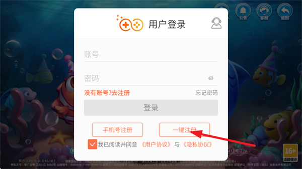 2、接着点击右下角的一键注册按钮进入游戏;