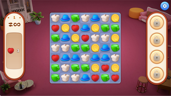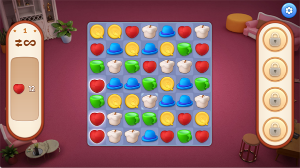 1、游戏通过完成三消关卡,获取金币与材料,用这些奖励一点点装饰、翻新你的家。