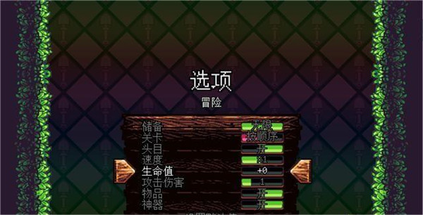 7、选项界面可调节游戏的各项设置,其中冒险设置可以调节冒险模式的游戏机制,储备表示玩家的命数,默认是1,也就是死亡之后全部重来,调高之后玩家死后可以在当前关卡直接复活,建议初次游玩调成无限或者稍高一点的数值。