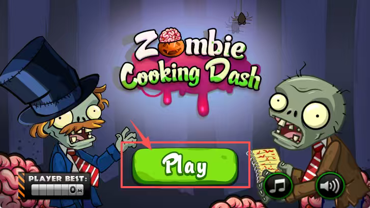 1、看到游戏启动界面,两个僵尸在中间,上方有彩色标题,直接点绿色 Play 按钮就能开始玩,左下角能看到自己最好成绩。