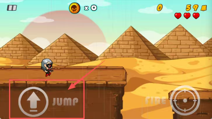 3、在横版闯关游戏场景里,看屏幕上方骷髅头数字和右侧金币数,点左下角红色方框里白色向上箭头就能让角色跳跃。