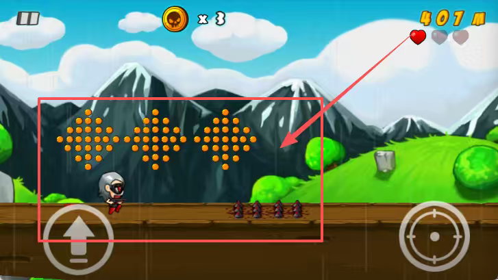 4、在手机横版跑酷游戏里,看上方金币和分数,用左下角向上箭头和右下角圆形按钮操控角色,注意避开障碍物。