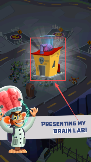 4、猴子旁边有大脑实验室的横幅,按照红色箭头指示点那个带骷髅头的小黄房子开始实验。