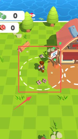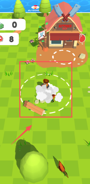 2、看圈起的牛仔角色,点虚线圆圈内区域操作,或点上方BUTCHER SHOP肉铺,还能看数字0/500进度。