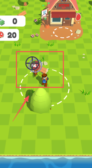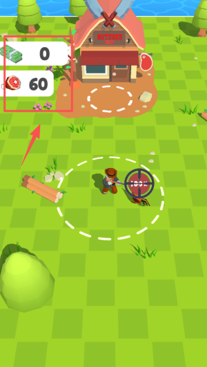 1、看戴帽持枪角色,点红色方框选中,或点右上角带BUY房子买东西,还能看左上角钞票和肉数量。