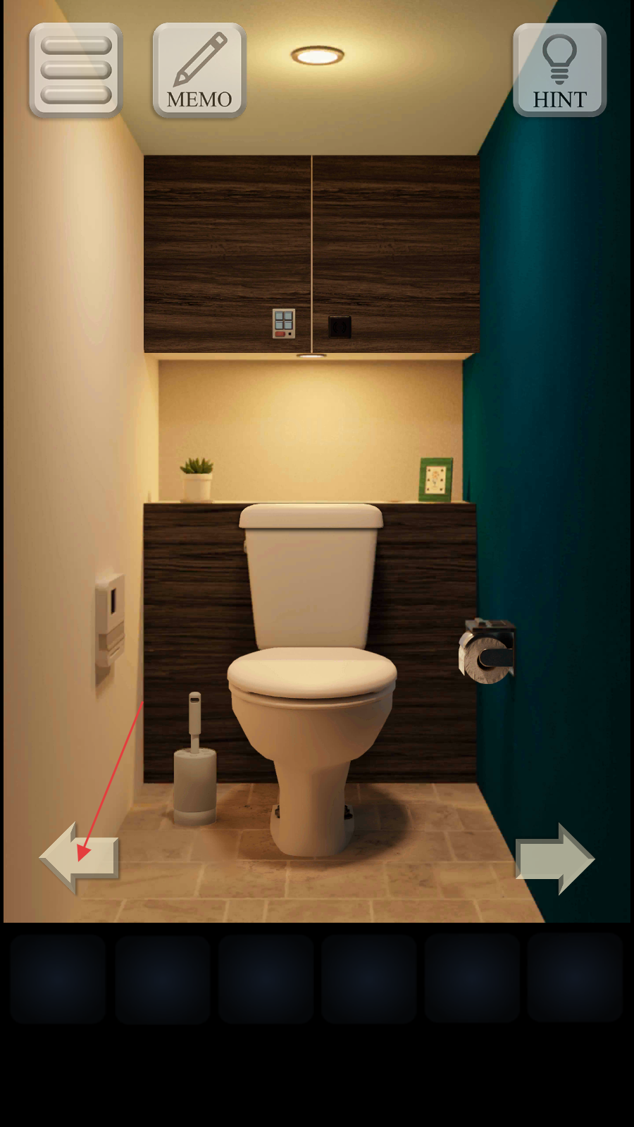 9.对照前面的线索(地砖图案、马桶盖图案、花盆底盘图案),点击红色按钮打开左上方柜子,获得【美工刀刀鞘】。