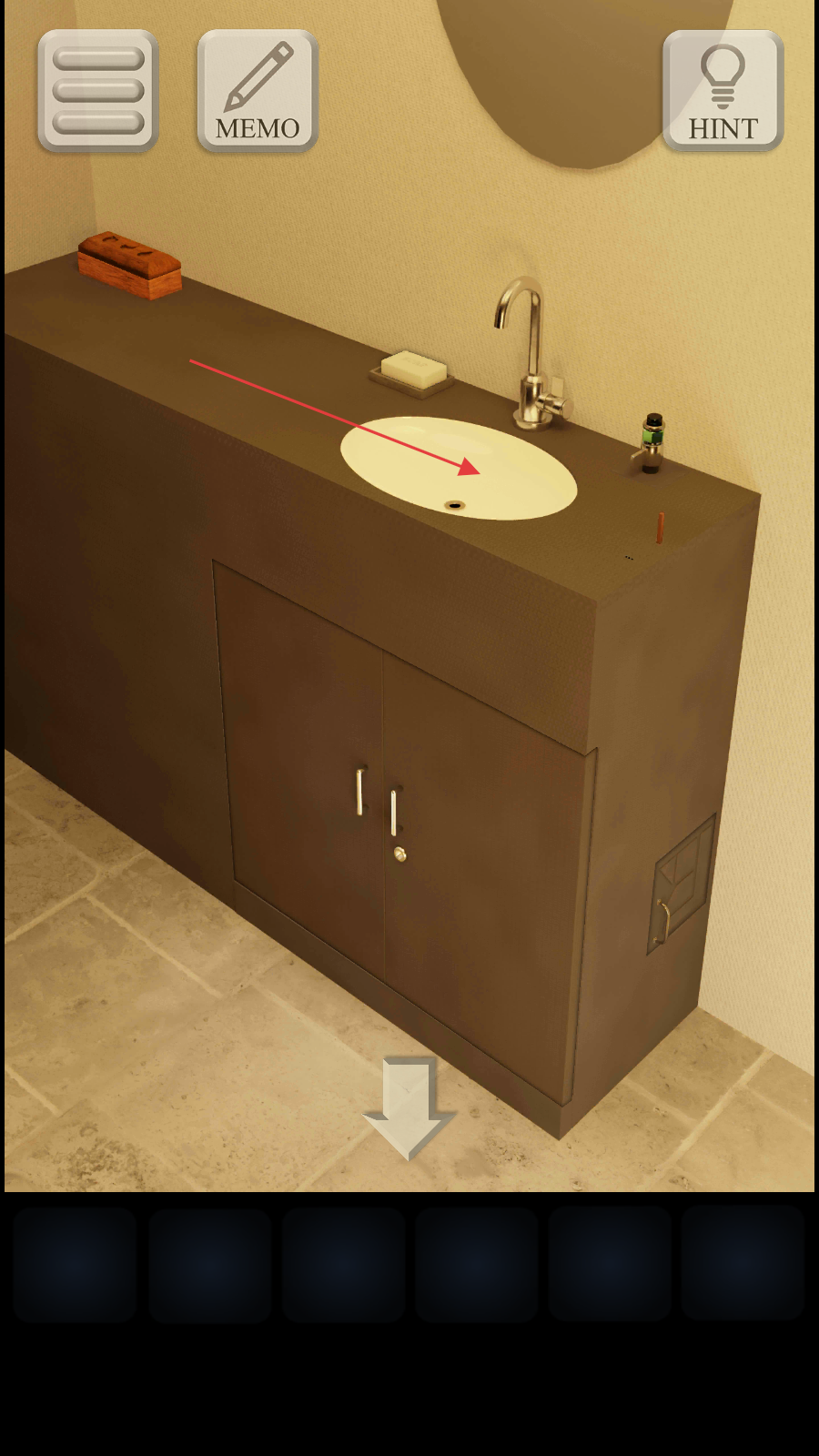 12.左转到门口,使用【钥匙】打开洗手池柜子,拾取里面的【半块苹果图案】。