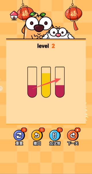 1、点击选择试管,我们需要将相同颜色的水倒入到同一个试管中,即可过关。
