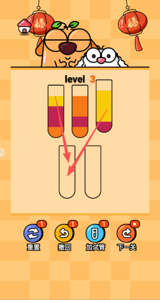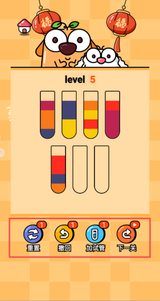 3、试管数量和颜色种类会增加,难度逐渐提升。需优先观察各试管的液体组成,从颜色占比大或组成简单的试管入手。