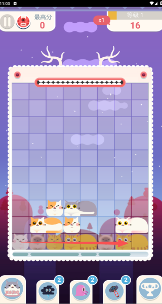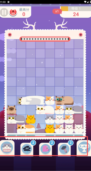 2、只有有一整排的小猫咪,我们就可以进行消除去获得分数的。