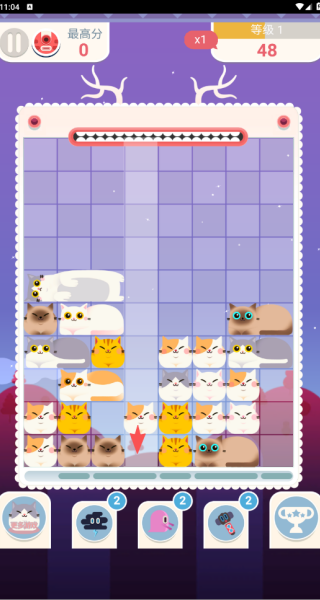 3、只需要知道,将上面的猫咪进行移动,让下面有一行可以消除的玩法就可以。