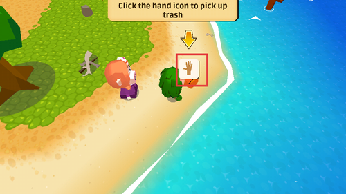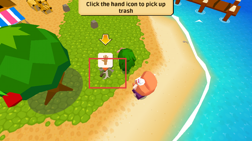 2、根据新手指引,点击屏幕上的手形图标,拾取散落在海滩的垃圾,保持岛屿环境整洁美观。