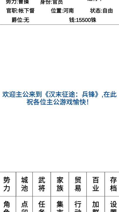 汉末征途兵锋游戏是一款模拟经营类文字游戏,游戏采用简约风格打造,以文字玩法为核心。游戏内玩家将来到三国时代,在这里你需要招募各种武将,通过不同的玩法来提升自己的势力,十分有趣。对汉末征途兵锋游戏感兴趣的玩家不要错过,欢迎大家在本站下载游玩。