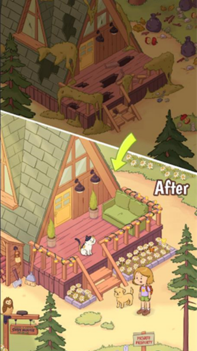 1、合成物品,修复旧木屋,让森林焕然一新。