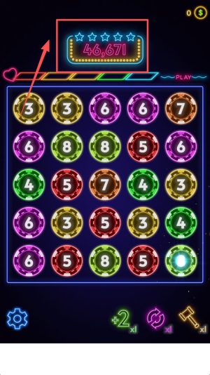 4、分数变成46671时,继续点数字相同的圆片消除,绿色+2按钮可以加倍分数,锤子能敲掉难处理的圆片。