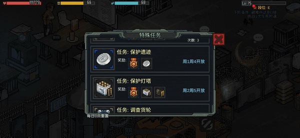 hello幸存者们,今天为大家分享像素危城中的特殊任务玩法。在生死时速玩法中,我们可以获得宠物的进阶材料,而在特殊任务当中我们则可以获得宠物的升级材料。