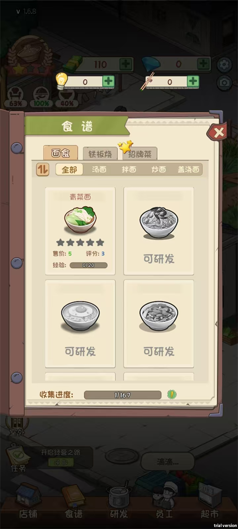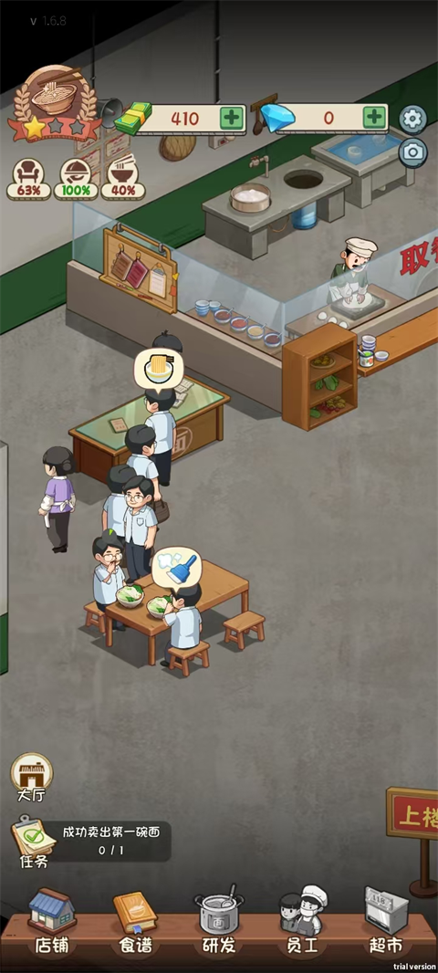 - 扩展你的面馆帝国,随着游戏进程推出各种新菜品和服务。