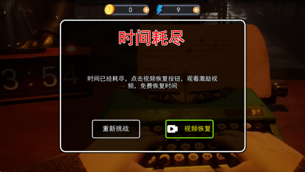 4、如下图所示,时间耗尽导致闯关挑战失败,只能够重新开始。