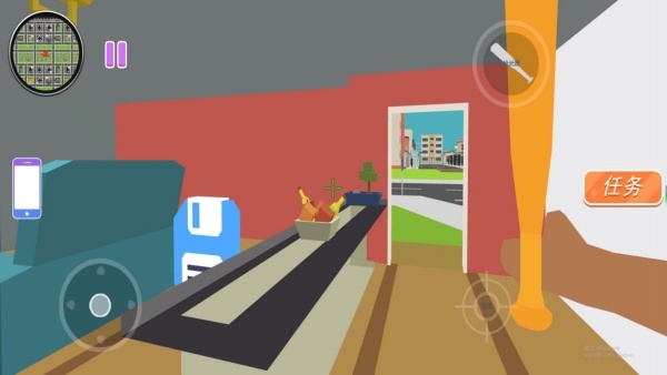 4、在室内场景中,利用虚拟摇杆移动,查看 “任务” 按钮获取目标,收集场景中的道具,同时留意门口的出口,准备前往室外执行任务。