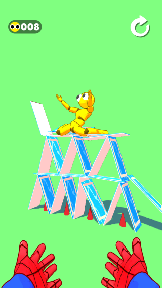 1、瞄准三角搭建的建筑,将其击垮,让木偶人从上面摔下来死亡。