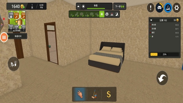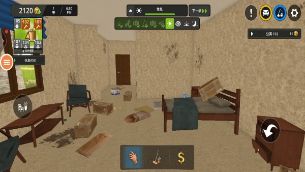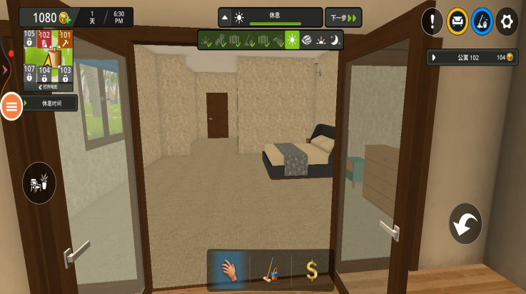 3、进入脏乱的公寓 102 后,先使用清洁工具清理垃圾和污渍,按照界面提示逐步整理房间。