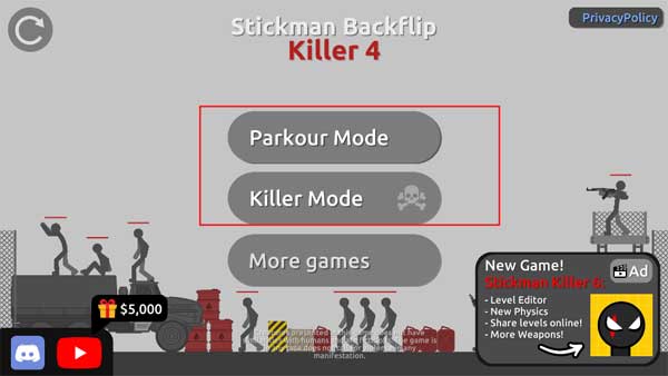 1、打开游戏之后你会看到有两种模式:跑酷模式和杀戮模式,点击“Parkour Mode”进入跑酷模式。