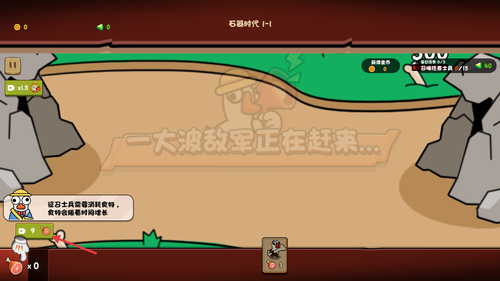 2、当敌军接近时,利用随时间积累的食物资源,点击下方征召按钮,召唤大鹅士兵组成防御阵线。
