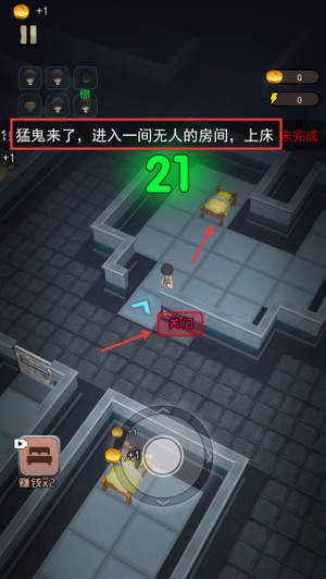 2、猛鬼出现时迅速进入空房间,点击关门并上床躺下,利用被窝暂时躲避追击。