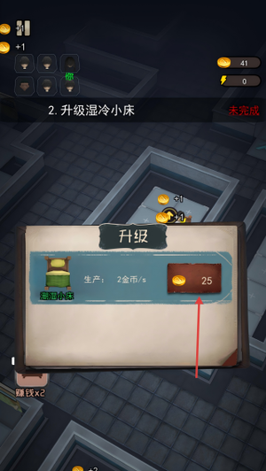 3、白天阶段使用积累的金币点击升级选项,将潮湿小床逐步强化为高级床铺加快产金速度。