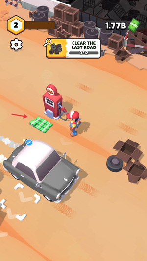 4、当加油站升至2级后,继续清理剩余道路障碍,同时收取油泵旁自动生成的货币,推进最终道路清理进度。