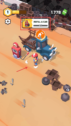 2、寻找停靠的蓝色卡车,操控角色靠近后触发互动提示,长按加油按钮为其补满燃料,完成REFILLACAR挑战。