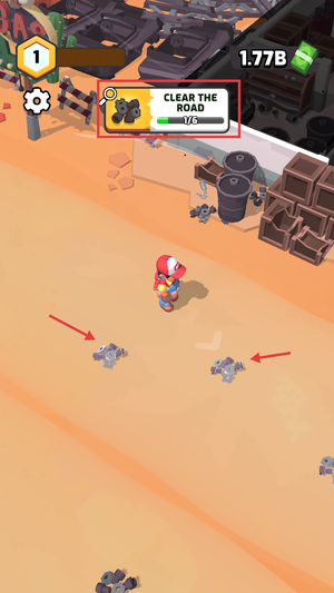 1、进入游戏后先查看任务列表,找到CLEARTHEROAD目标,靠近地面上的齿轮并点击收集,逐步完成六组收集任务。