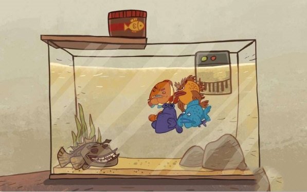 29、第二十九关:大鱼要吃小鱼,好怕怕。点击页面上的鱼食,挪到左边,可以看到后面有一瓶,能力瞬间变大的能量药,倒进水里,给小鱼吃。再点一下大鱼,大鱼顿时吓尿啦。