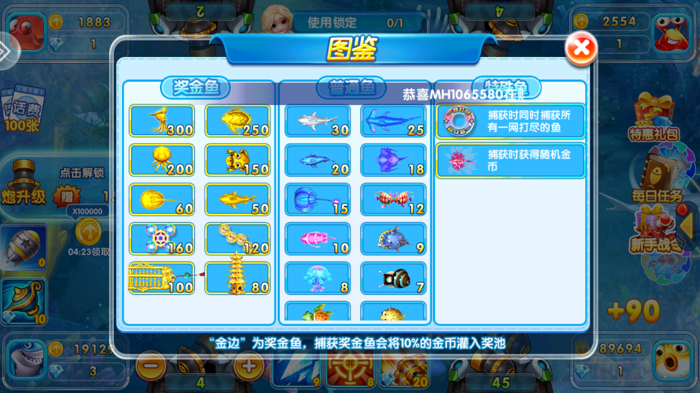 2、有金币许愿、超级奖池、鱼王争霸、猎鱼高手等多种活动等你来体验;