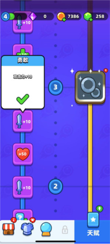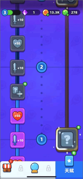 首先这个紫色天赋石主要是升级天赋的,在游戏右下角有个天赋按钮,进入之后就可以看到左右两个解锁线路,左边是一些词条天赋比如攻击力、恢复能力、生命值上限等,这些只需要金币解锁,而且金币获得途径很多所以不用担心。右边的线路天赋就需要用到天赋石来解锁了。