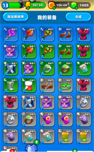 游戏中装备分为优秀、稀有和史诗装备,优秀大家都叫他史诗装备,是前期玩家的主要装备,可以通过砰砰宝箱抽取获得,也可以在关卡中获得。稀有和史诗装备是属性较好的装备,可以通过砰砰宝箱抽取和合成获得,史诗宝箱的掉落概率很低,所有对于平民玩家来说一套稀有装就很不错了。