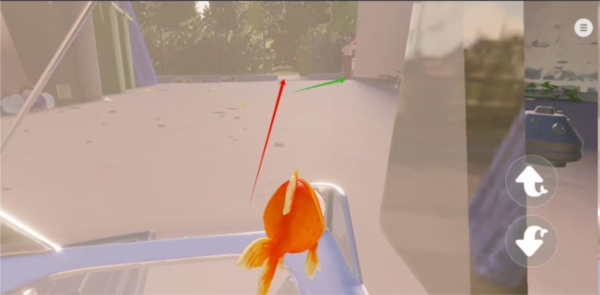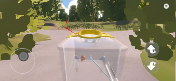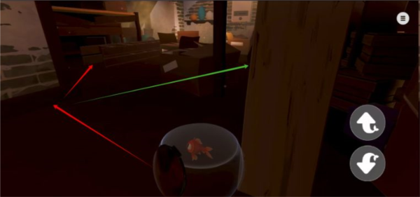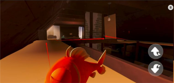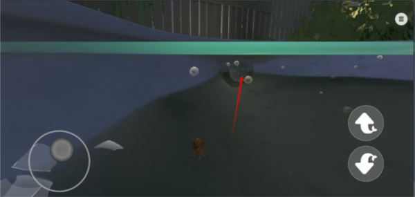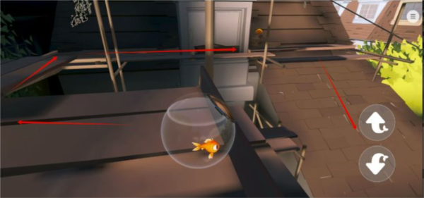 1.首先是金鱼跃起闯过管道来到水箱内,利用跳跃到达桌面上的鱼缸,沿着【银杏叶】标识向前滚动鱼缸来到滤网上。沿着滤网前进,达到中央位置后跌落进入大浴缸内。